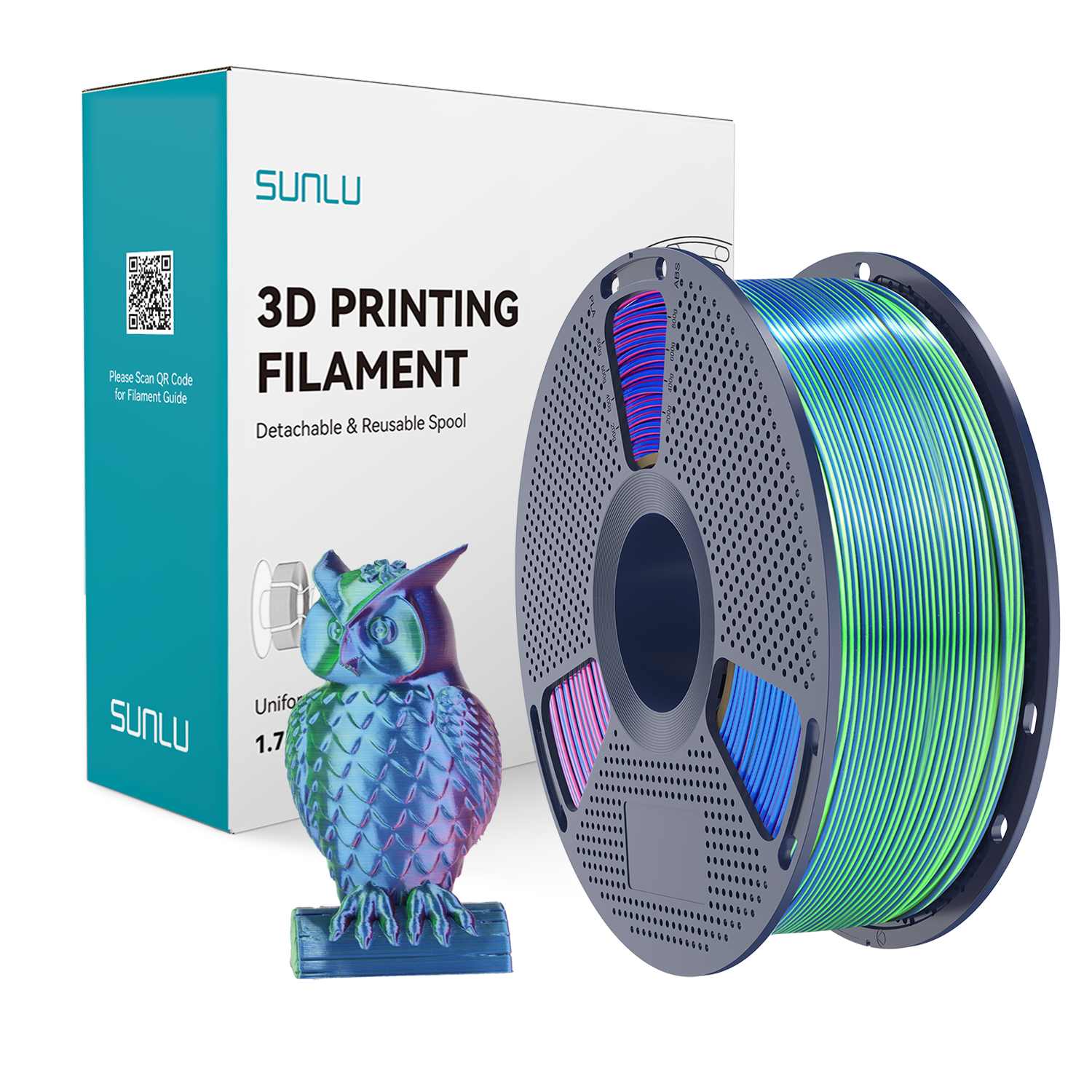 - SILK PLA+ to wysokiej jakości jedwabisty filament do drukarek 3D, wyprodukowany przez SUNLU. Filament TRI Color to połączenie trzech różnych kolorów na całej długości filamentu, co pozwala uzyskać niespotykany efekt kolorystyczny. Kolor: Blue Green Purple
