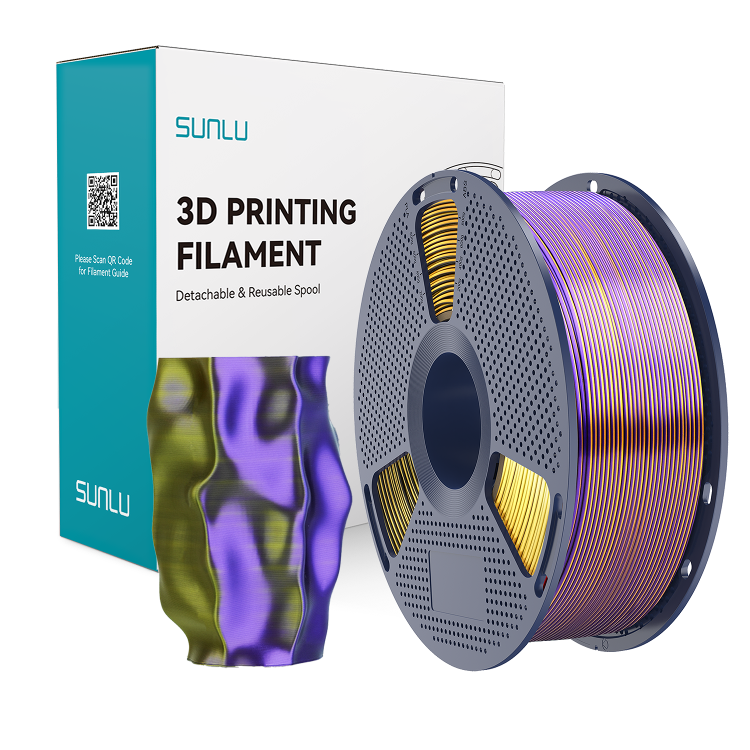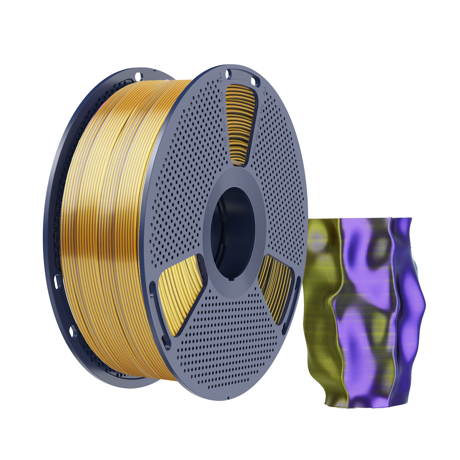 SUNLU SILK PLA+ Dual Color to wyjątkowy filament powstały z połączenia 2 kolorów SILK PLA+ na całej długości filamentu. Pozwala to uzyskać wydruki o niespotykanym efekcie wizualnym. Wydruk zdaje się mieć inny kolor z różnych perspektyw.